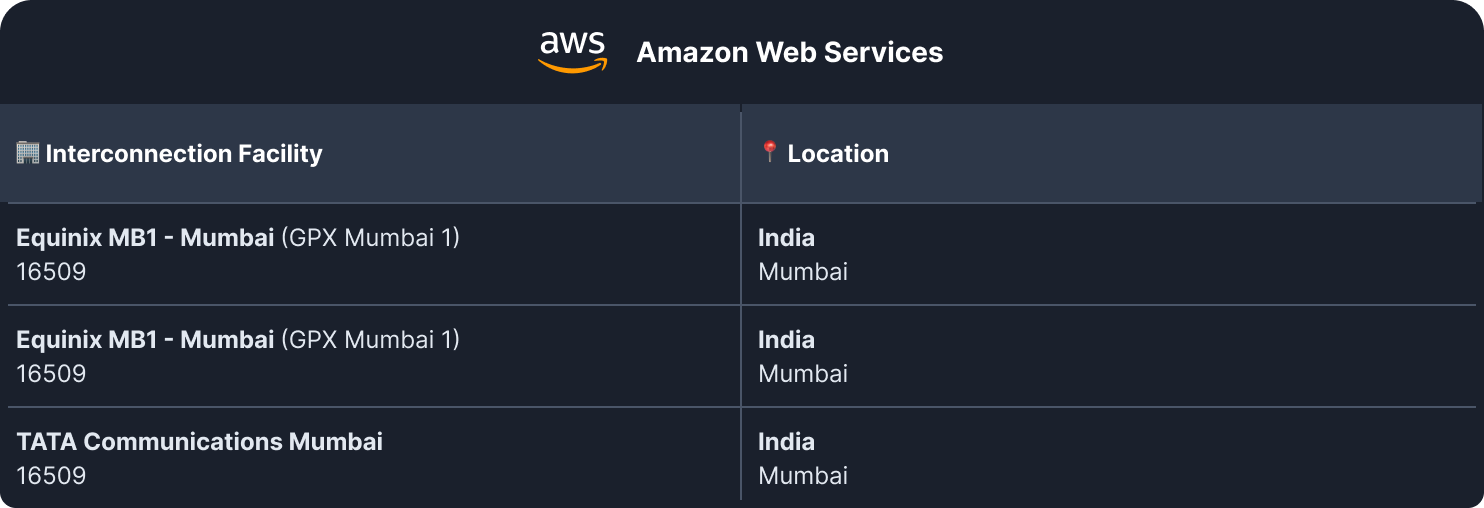 To understand why some AWS regions have really low latency access to a Cloudflare PoP, all you need to do is follow the wire. At the end of the day, these are physical networks with fiber optics connecting them at an Interconnection Facility. As an example, the ap-south-1 (Mumbai) AWS region is peering at three facilities: