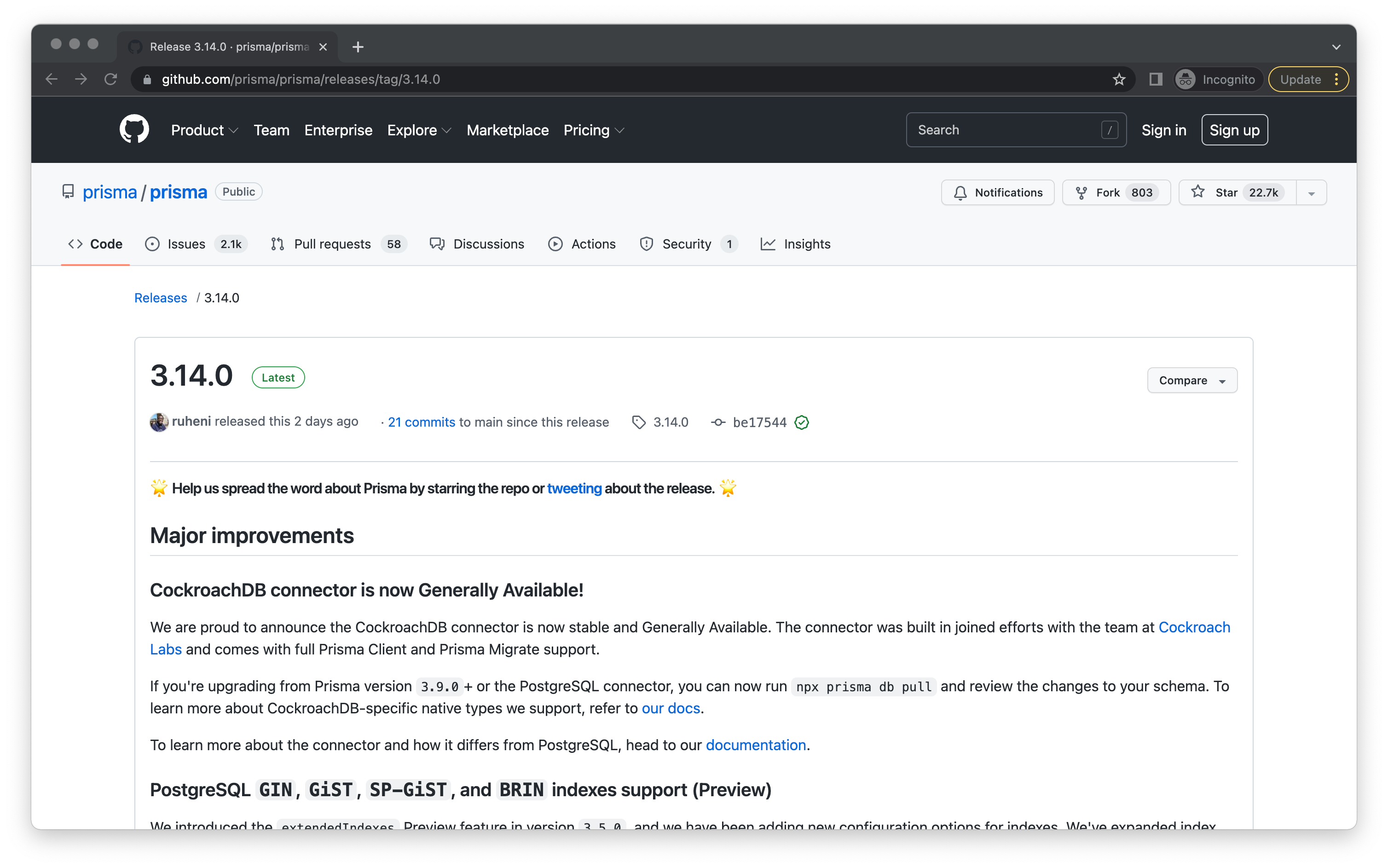 Back in February, as part of the 3.9.0 release of Prisma, preview support for CockroachDB was added. Today, as CockroachDB announces their 22.1 release, we are excited to officially announce the general availability of Prisma's CockroachDB connector.
