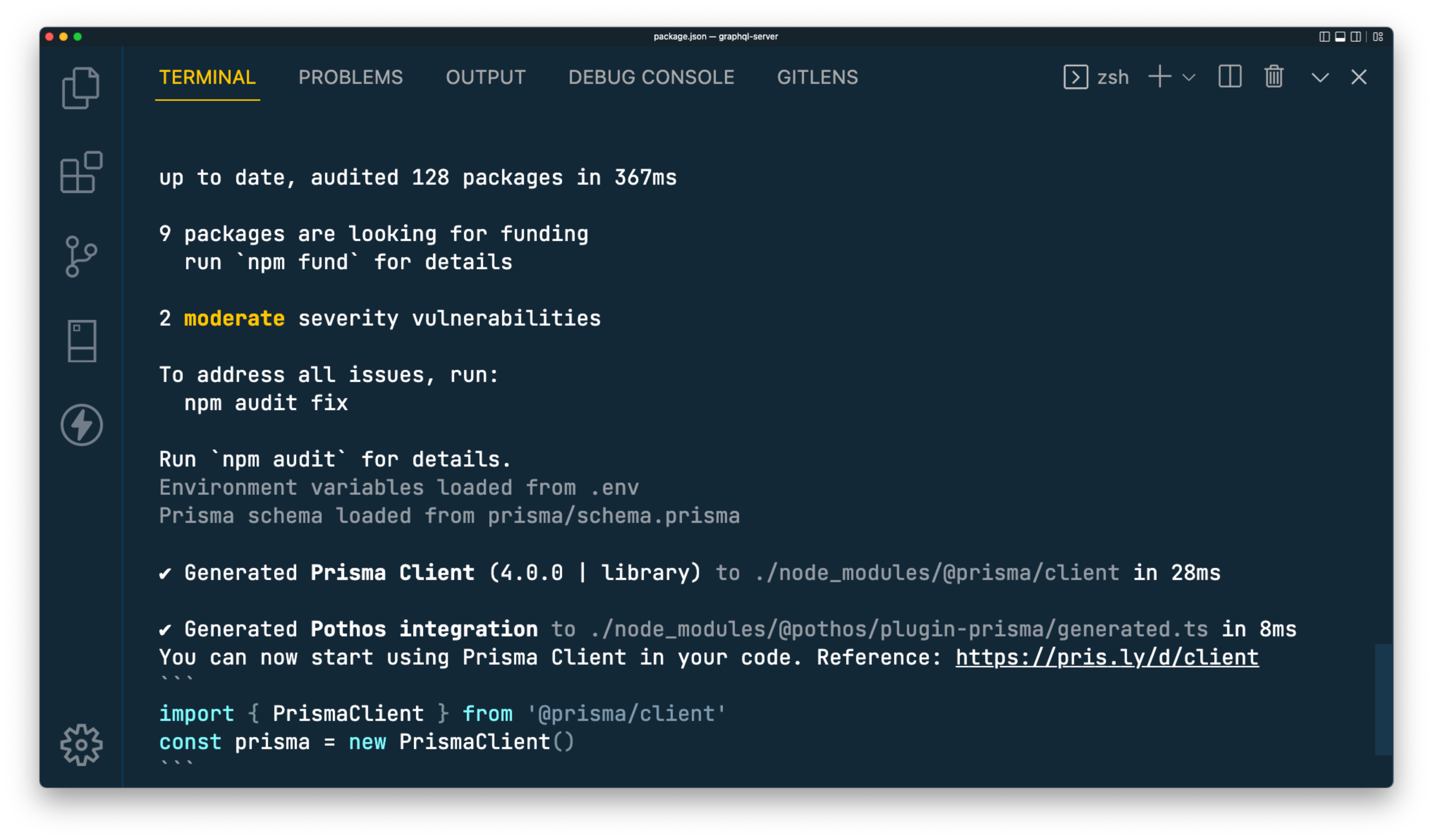 npm i @pothos/plugin-prismaThis plugin provides a Prisma generator that generates the types Pothos requires. Add the generator to your Prisma schema in prisma/schema.prisma: