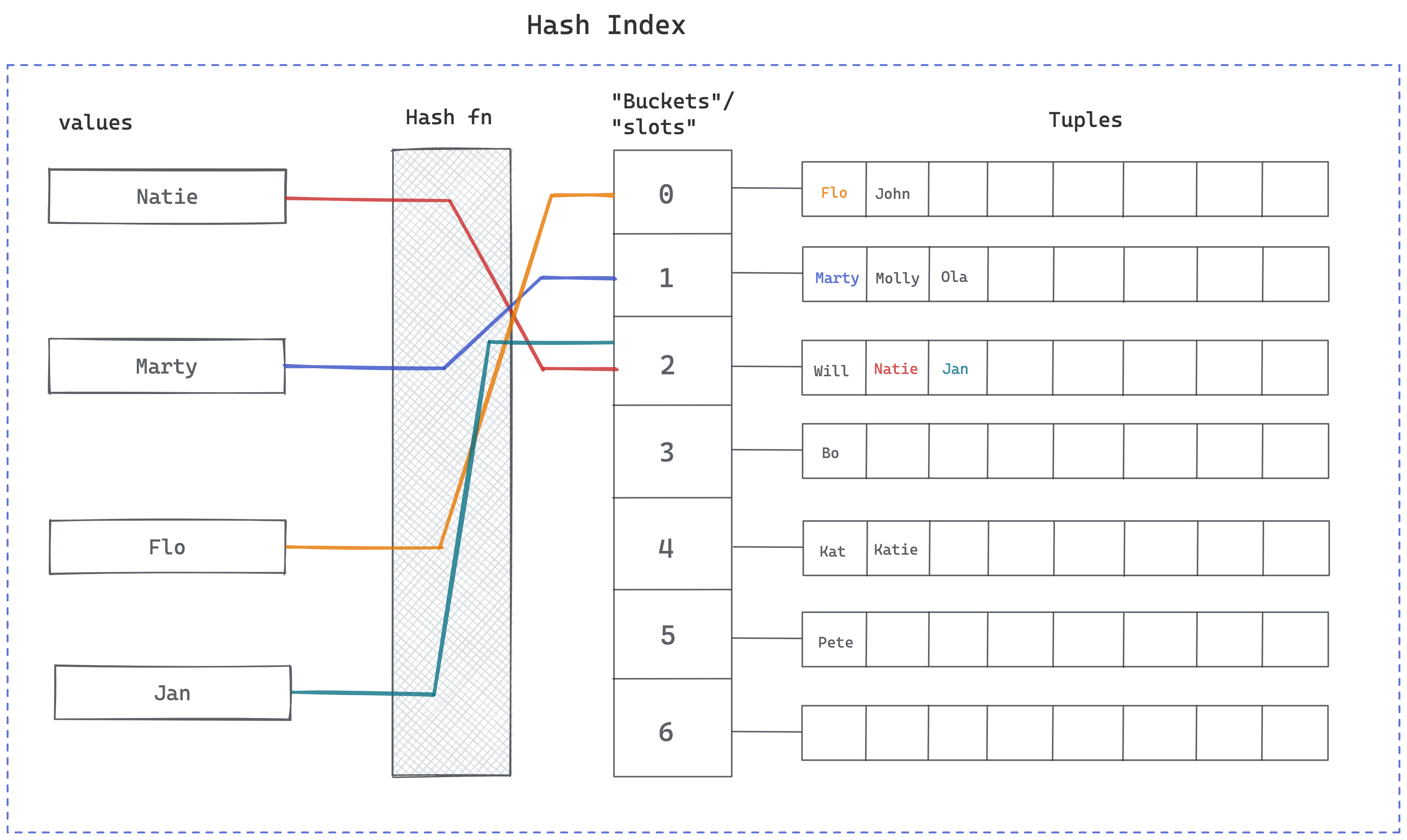 PostgreSQL's hash index is composed of "buckets" or "slots" into which tuples are placed.
