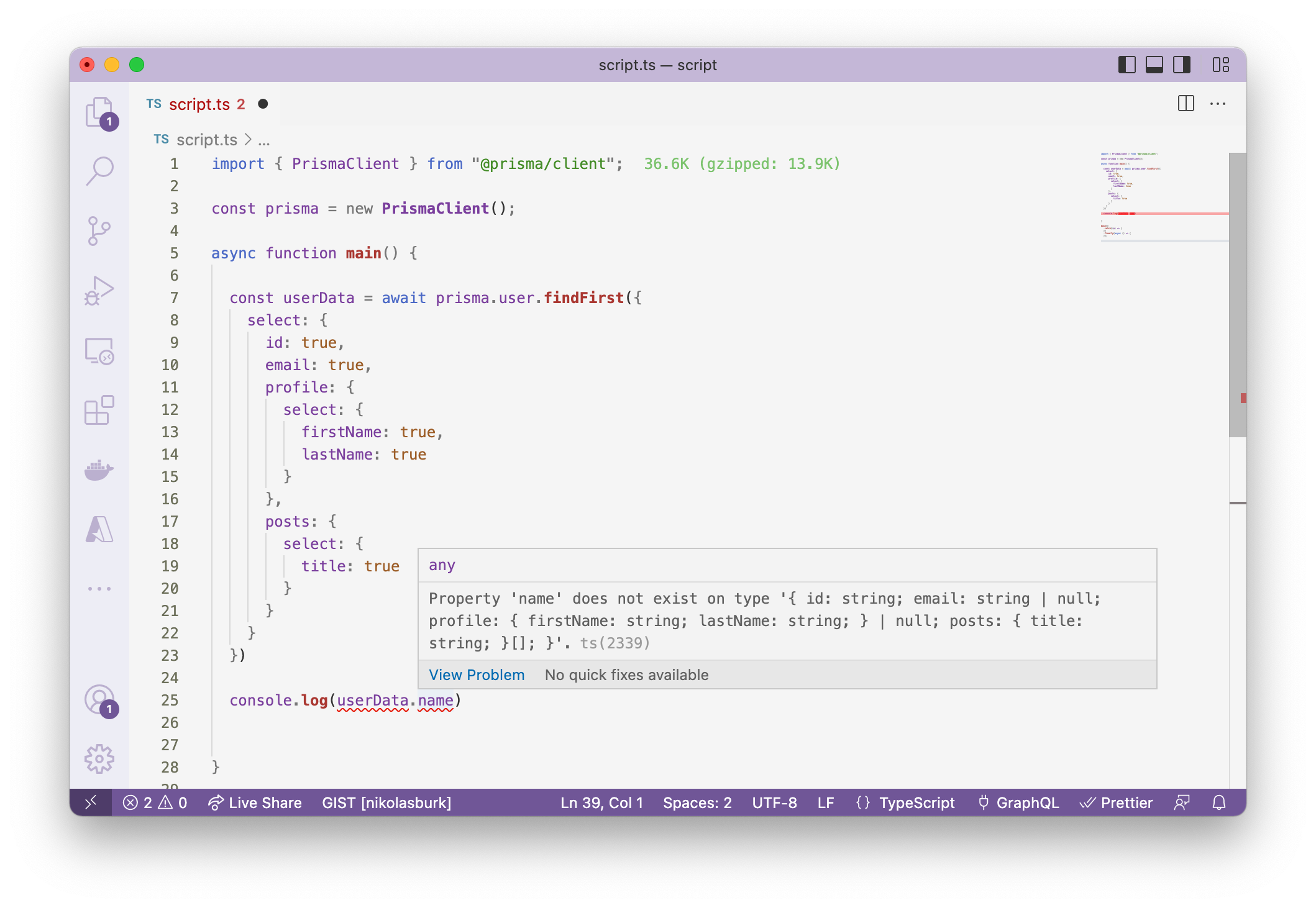 - The TypeScript compiler will catch cases where you accidentally access a field that was not returned from the query.