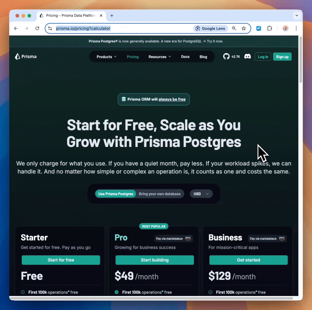 While it's simple, it may feel unfamiliar because it's so different from existing pricing models. To understand how much you'd pay for Prisma Postgres running your app, you can now use our Pricing Calculator. Put in the predicted storage and number of operations to see how much you're going to be charged on each plan.
