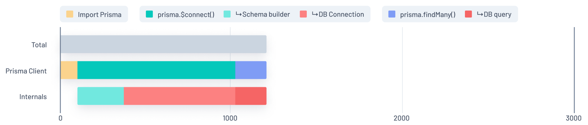 In this graph, the Blue section of the Prisma Client bar represents the time spent running a findMany query during a function's initial invocation. That time is split into two chunks in the Internals bar: Purple and Red.